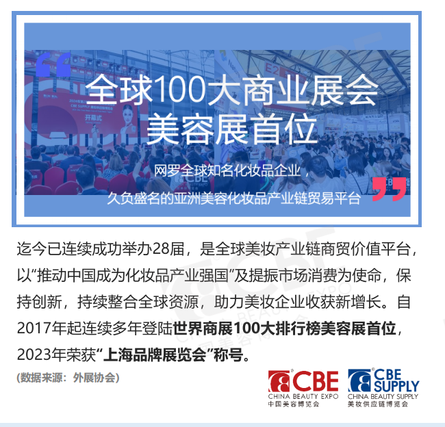2. 趨勢(shì)發(fā)布平臺(tái)科技驅(qū)動(dòng):130+場(chǎng)活動(dòng)中,30%聚焦"美妝科技"(如智能防曬、仿生彩妝),2025年數(shù)據(jù)顯示:彩妝:53%新品含護(hù)膚活性成分,"仿生技術(shù)"同比增長(zhǎng)120%;防曬:智能反應(yīng)型產(chǎn)品增速達(dá)75%,兒童/敏肌專用占比提升至40%。二、逛展必看三大焦點(diǎn)【焦點(diǎn)1】科技首發(fā)專區(qū)彩妝革命:嬌時(shí)蜜糖琥珀唇釉(N1F05):心鎖成膜技術(shù)實(shí)現(xiàn)24小時(shí)持妝,現(xiàn)場(chǎng)體驗(yàn)"觸感實(shí)驗(yàn)室"。瑩特麗提拉底妝(NVIP5):Galaxy Technology彈性流體,實(shí)時(shí)演示輪廓緊致效果。智能防曬:澳思美蠶絲防曬(N1M09):術(shù)后可用的包裹技術(shù),提供膚質(zhì)測(cè)試服務(wù)。科瑪御水防曬(N1B14):現(xiàn)場(chǎng)水汗測(cè)試SPF50+持久力。國(guó)際大健康專區(qū)簡(jiǎn)介《“健康中國(guó)2030”規(guī)劃綱要》提出,應(yīng)把健康擺在優(yōu)先發(fā)展的戰(zhàn)略地位。CBE中國(guó)美容博覽會(huì)緊跟市場(chǎng)脈搏·順勢(shì)而為,E5館內(nèi)煥新升級(jí)CBE大健康特色專區(qū),匯聚中醫(yī)養(yǎng)生、營(yíng)養(yǎng)保健、康養(yǎng)設(shè)備、育發(fā)養(yǎng)發(fā)、康復(fù)調(diào)理、精油療愈等細(xì)分熱門品類,著力打造集商貿(mào)對(duì)接、品牌展示、行業(yè)洞察、渠道拓展及健康體驗(yàn)于一體的大健康產(chǎn)業(yè)集聚交流平臺(tái),一站式滿足個(gè)性化的大健康采買需求!中國(guó)美容博覽會(huì)01. 國(guó)際大健康展品范圍中醫(yī)養(yǎng)生艾灸溫灸產(chǎn)品營(yíng)養(yǎng)保健康養(yǎng)設(shè)備育發(fā)養(yǎng)發(fā)/頭療美體塑型康復(fù)調(diào)理精油療愈02. 為何參展直面VIP買家和品牌潛在客戶的高層決策者觸達(dá)超過40+個(gè)國(guó)家和地區(qū)的高質(zhì)量買家與國(guó)內(nèi)30+個(gè)全國(guó)各省市美容協(xié)會(huì)緊密的聯(lián)系尋找更多商機(jī)發(fā)布新產(chǎn)品、推廣新技術(shù)的國(guó)際交流平臺(tái)十余場(chǎng)大健康垂類精彩活動(dòng)助力參展商拓展業(yè)務(wù)多渠道、多形式、多角度宣傳,助力參展商提升品牌影響力與行業(yè)zhiming度03. 為何參觀深度打通美業(yè)與大健康兩大產(chǎn)業(yè),全球大健康美業(yè)資源聚合高地深耕大健康多元細(xì)分領(lǐng)域,集結(jié)國(guó)內(nèi)外50+家國(guó)際大健康企業(yè)品牌十余場(chǎng)大健康垂類主題活動(dòng),與業(yè)內(nèi)quanwei專家共同解讀行業(yè)趨勢(shì)發(fā)展搶先一步獲取市場(chǎng)熱點(diǎn),掌握行業(yè)新動(dòng)向,尋找合作商機(jī)04. 誰(shuí)將參觀精準(zhǔn)滲透華東六省一市,zhanlingshichang核心高地!近80%成為企業(yè)決策人,更快落成合作決策!養(yǎng)生會(huì)所/健康管理機(jī)構(gòu)/康養(yǎng)機(jī)構(gòu)院線連鎖/沙龍/皮膚管理門店專業(yè)美容品牌代理商/經(jīng)銷商直播電商/跨境電商/自媒體電商紅人/MCN/帶貨主播/微店/抖店