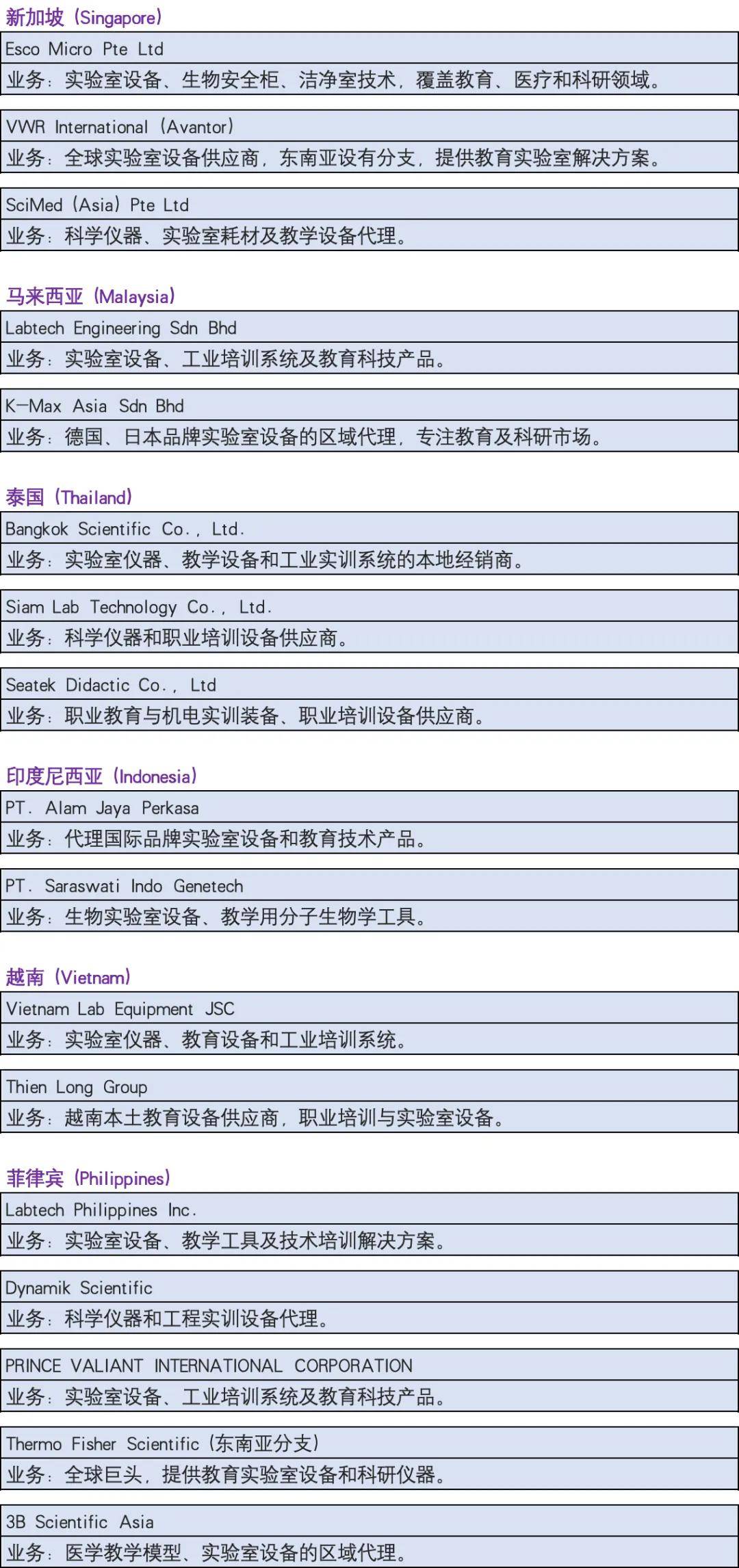 東南亞地區(qū)活躍的教育裝備、實驗室儀器及實訓設備的經(jīng)銷商或代理企業(yè),涵蓋多個國家及領域。這些公司提供科學實驗室設備、職業(yè)培訓系統(tǒng)、教育技術解決方案等。