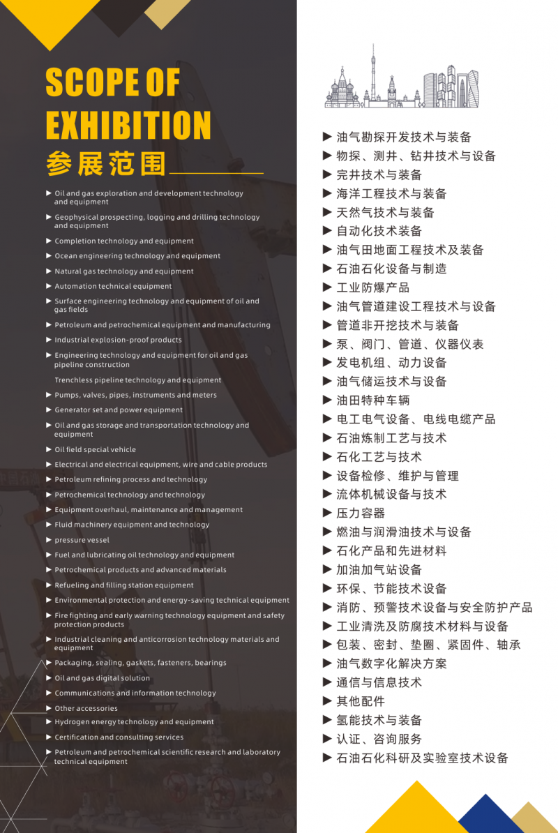 油氣勘探開發技術與裝備,物探、測井、鉆井技術與設備,完井技術與裝備,海洋工程技,術與裝備,天然氣技術與裝備,自動化技術裝備,油氣田地面工程技術及裝備,石油石化設備與制造,工業防爆產品,油氣管道建設工程技術與設備,管道非開挖技術與裝備,泵、閥門、管道、儀器儀表,發電機組、動力設備,油氣儲運技術與設備,油田特種車輛,電工電氣設備、電線電纜產品,石油煉制工藝與技術,石化工藝與技術,設備檢修、維護與管理,流體機械設備與技術,壓力容器,燃油與潤滑油技術與設備,石化產品和先進材料,加油加氣站設備,環保、節能技術設備,消防、預警技術設備與安全防護產品,工業清洗及防腐技術材料與設備,包裝、密封、墊圈、緊固件、軸承,油氣數字化解決方案,通信與信息技術,其他配件,氫能技術與裝備,認證、咨詢服務,石油石化科研及實驗室技術設備。