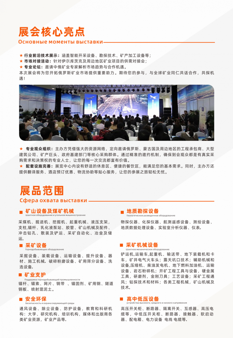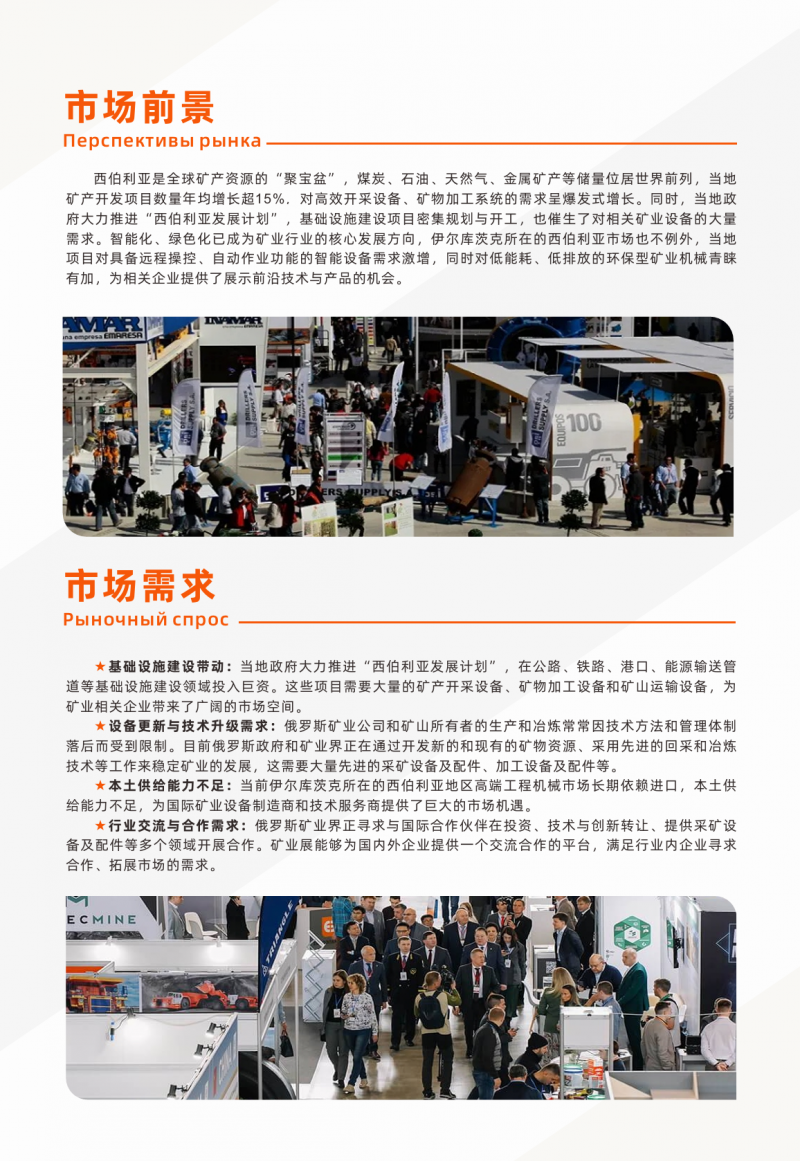 ● 市場(chǎng)對(duì)接活動(dòng):針對(duì)伊爾庫(kù)茨克及周邊地區(qū)礦業(yè)項(xiàng)目的供需對(duì)接會(huì)。