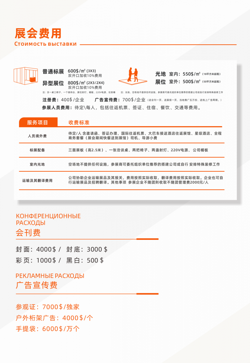 普通標(biāo)展 600USD/㎡ 非標(biāo)準(zhǔn)展位 室內(nèi)光地 550USD/㎡ 室外光地 500USD/㎡