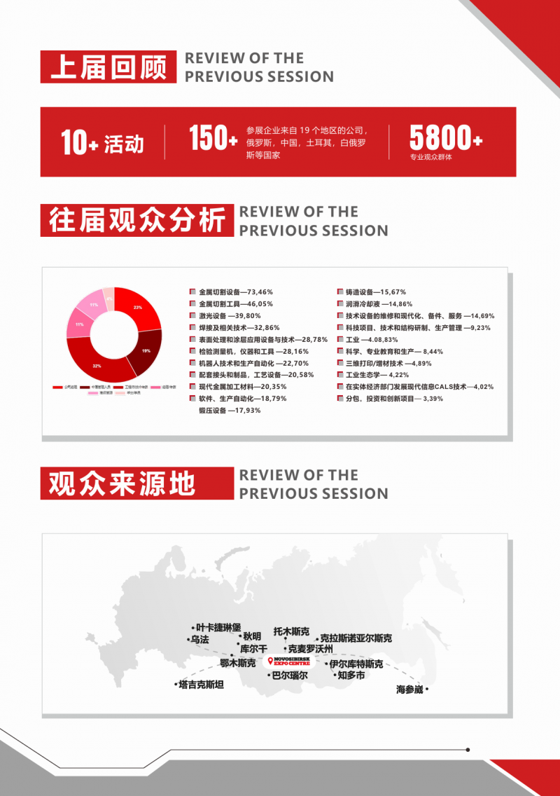 該展會由Siberian Exhibition Company LLC主辦,每年一屆,是烏拉爾東部最大的金屬加工和焊接國際展覽會。每屆展會能吸引來自俄羅斯東部地區最大的機床和焊接設備制造商以及大中型工業企業代表參展,也會吸引超過5000名專業觀眾,匯集了金屬加工和焊接設備、工具和技術的制造商和供應商,展示該行業的最新創新和進步。與會者有機會探索廣泛的產品和服務,與行業專業人士建立聯系,并深入了解金屬加工和焊接領域的最新趨勢和最佳實踐。