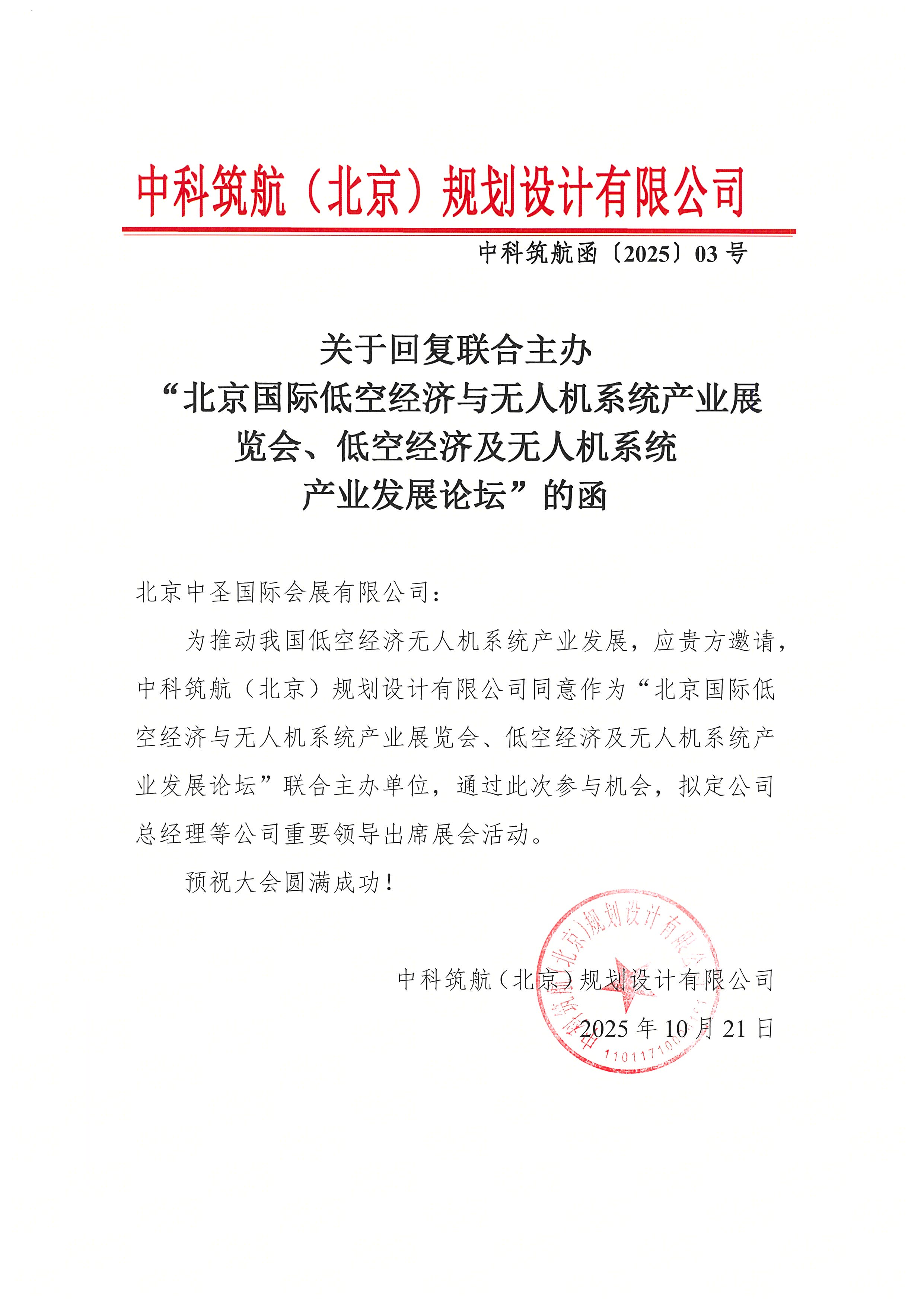 中科筑航(北京)規劃設計有限公司關于回復聯合主辦“北京國際低空經濟與無人機系統產業展覽會、低空經濟及無人機系統產業發展論壇”的函,展會時間為2026年6月26日-28日在北京首鋼國際會展中心隆重召開。