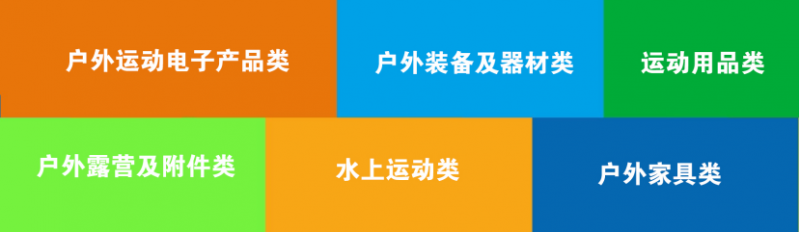 3、戶外露營及附件類展區:長途旅游、戶外房車、太陽能背包、登山包、急救包、指南針/定位系統、炊具/燃料、急救用品、應急燈、登山鞋,徒步鞋,高山靴,攀巖鞋,沙灘鞋/涼鞋、戶外休閑鞋、戶外手電筒、護具、戶外水壺、頭盔、防潮墊、地席水壺、水具爐具、燒烤爐、通訊/導航、戶外刀具、戶外表、射擊、望遠鏡、登山杖、手杖毛巾、戶外移動電源等