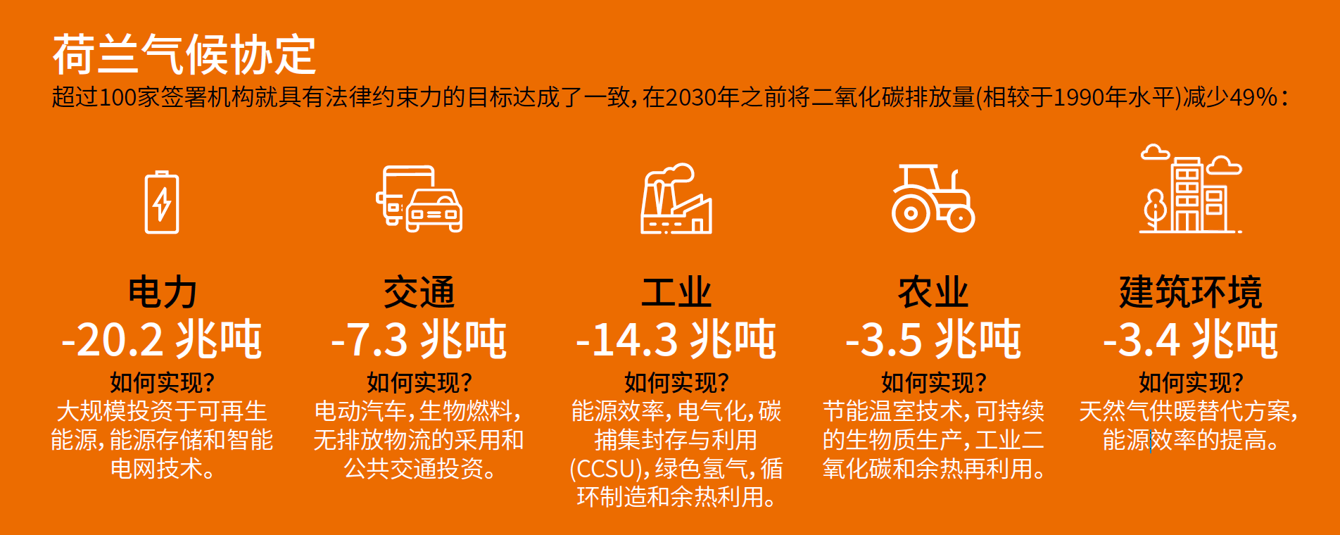 4. 荷蘭積極響應歐盟2050年實現碳中和的承諾,并于2019年率先將其轉換為法律——由荷蘭政府、各產業部門為數眾多的企業和機構共同簽訂的《荷蘭氣候協定》。各方共同承諾,到2030年,將荷蘭的溫室氣體排放量降至1990年水平的49%。荷蘭計劃到2030年,全國可再生能源(不含水能)占比達到25%。2020年這個比例為11%,其中約54%為生物質能,23%為海上風能(含離岸風能和近岸風能),14%為光伏太陽能。