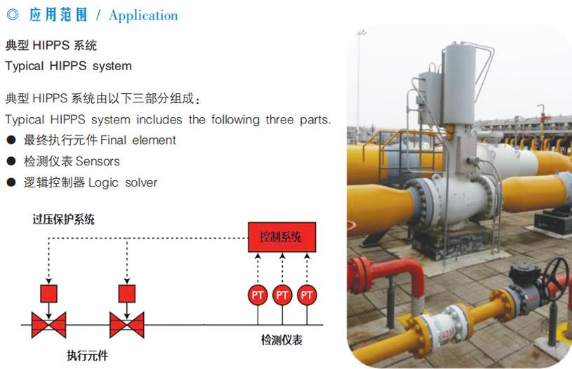 1、在可壓縮流體系統中,過壓保護系統(HIPPS)是高等級的壓力保護系統。 過壓保護系統(HIPPS)是操作范圍很廣的獨立系統,使用可靠耐用的軸流式安全切斷閥,以及相關的儀表關斷過壓源。 該壓力保護系統的總反應時間少于 2 秒。